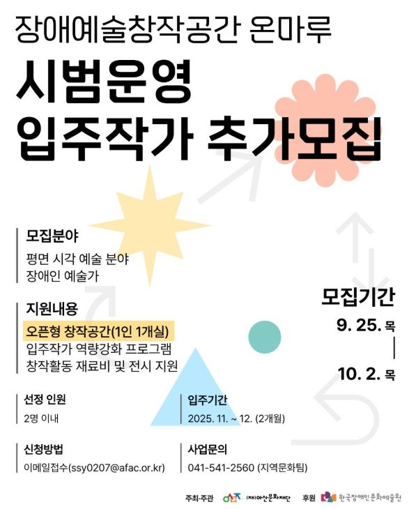 [ 타임즈 - 김시창 기자 ] (재)아산문화재단은 ‘2025년 장애예술 거점 창작공간 운영 지원사업 '장애예술창작공간 온마루'’에 참여할 장애인 예술가 2명을 10월 2일까지 추가로 모집한다고 밝혔다.