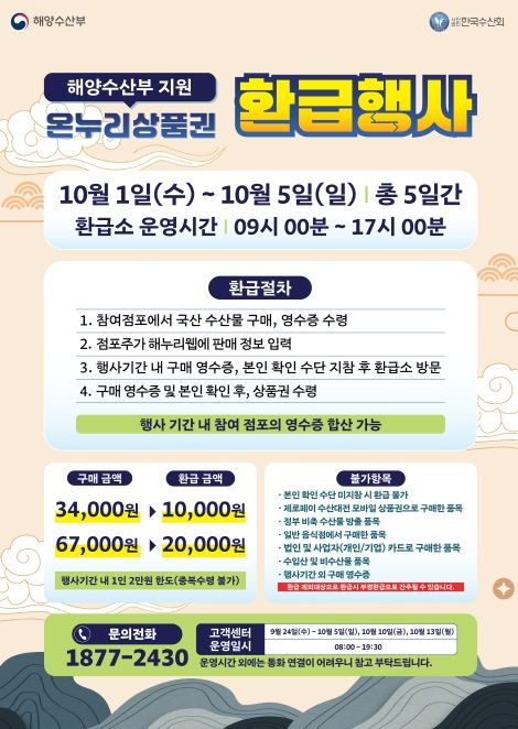 환급 금액은 행사 기간 내 1인 2만원 한도를 원칙으로 행사 기간 내 국산 수산물 구매 금액이 △3만4천원 이상 6만7천원 미만일 경우 1만원 △6만7천원 이상은 2만원을 온누리상품권으로 환급받을 수 있다.