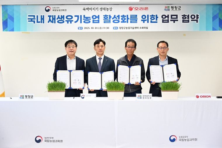 군은 10월 1일 평창군농업기술센터에서 농촌진흥청 국립농업과학원, ㈜오리온, 육백마지기 농장과 함께 ‘재생 유기농업 기반 조성을 위한 업무협약(MOU)’을 체결했다고 밝혔다. 이번 협약은 기후변화 대응과 지속 가능한 농업 확산을 목표로 한 새로운 민관 협력 모델이라는 점에서 의미가 크다.