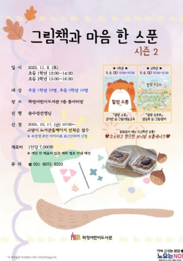 ‘가을’과 관련된 그림책을 읽고 ‘보늬밤 보틀케이크’동화요리 만들기를 함께 체험할 수 있는 이 프로그램은 ▲1학년(13:00~14:30) 『알밤 소풍』 ▲2학년(15:00~16:30) 『알밤 운동회』로 주제도서와 시간대를 연령별로 달리하여 진행한다.
