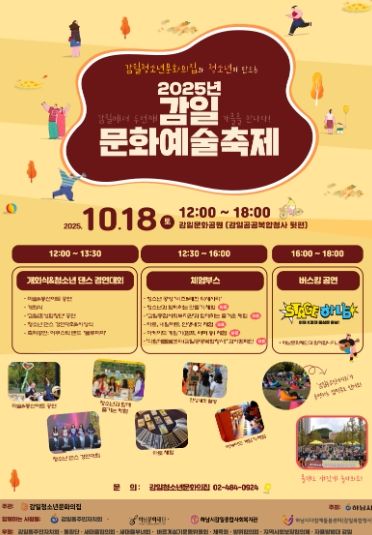 [ 타임즈 - 김시창 기자 ] 하남시 감일청소년문화의집은 오는 10월 18일 오후 12시부터 18시까지 감일문화공원(감일공공복합청사 뒷편)에서 '제2회 감일문화예술축제'를 개최한다.