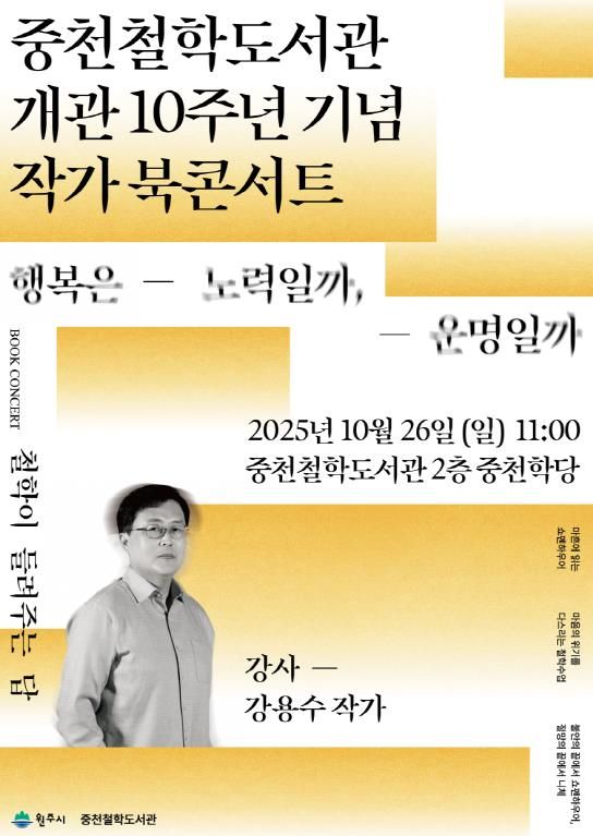 [ 타임즈 - 김시창 기자 ] 원주시 중천철학도서관은 오는 26일 오전 11시, 개관 10주년 기념 작가 북콘서트를 개최한다.