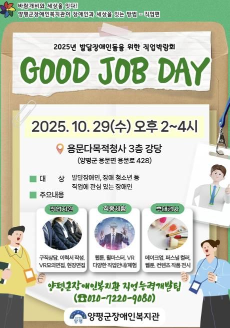 [ 타임즈 - 김시창 기자 ] 대한불교조계종사회복지재단이 운영하는 양평군장애인복지관은 오는 29일 오후 2시부터 4시까지 용문다목적청사 3층 강당에서 발달장애인의 직업 탐색 기회를 지원하기 위한 직업박람회 ‘GOOD JOB DAY’를 개최한다.