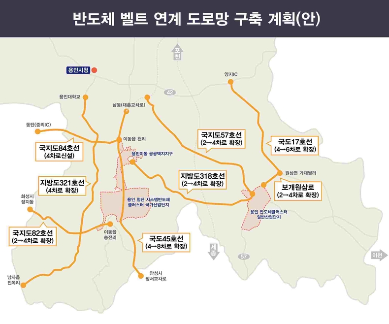 국도 제45호선 확장도 눈에 띈다. 현재 4차로 12.5km 구간을 8차로로 확장하는 1조 원 규모의 사업이 예타 면제로 빠르게 추진 중이며 2030년 국가산단 구간, 2031년 전 구간 완공을 목표로 한다. 이 밖에 화성 양감~안성 일죽을 잇는 반도체 고속도로와 기흥~양재 구간 지하 고속도로도 속도를 내고 있다.