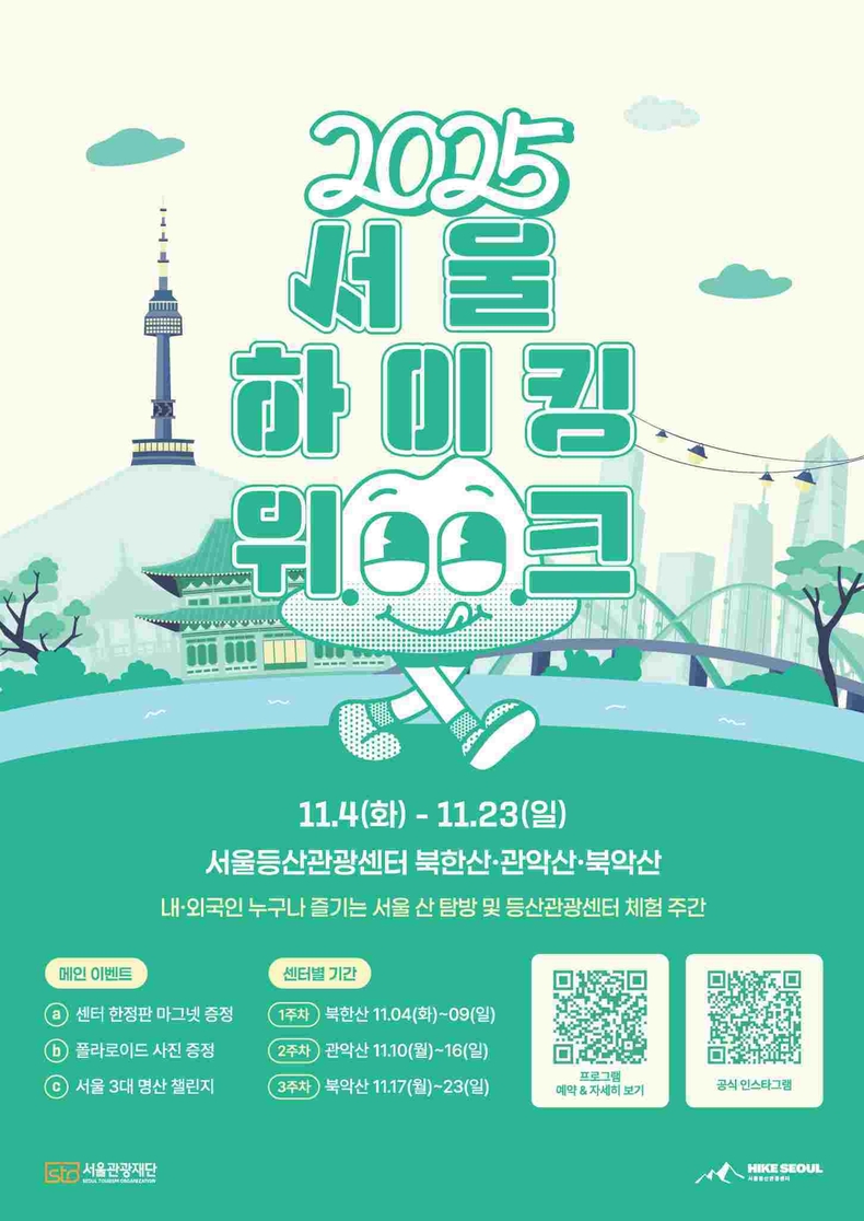 □ 서울관광재단(대표이사 길기연)은 11월 가을 등산 성수기를 맞아 서울 등산관광센터 3개소(북한산‧북악산‧관악산)를 홍보하고 인지도를 제고하기 위한 2025 서울 하이킹위크를 개최한다고 밝혔다.