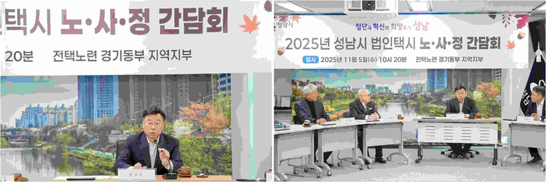 [ 타임즈 - 김시창 기자 ] 성남시는 11월 5일 오전 10시 20분 시청 제1회의실에서 법인택시 노‧사‧정이 함께하는 간담회를 열고, 지역 택시업계의 현안을 공유하며 발전 방향을 논의했다.