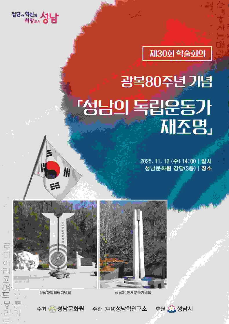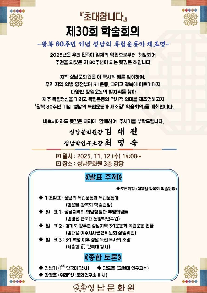 김대진 성남문화원장은 “광복 80주년을 맞이한 올해는 우리 지역의 항일운동가와 독립운동사를 다시 살펴볼 뜻깊은 시점”이라며, “이번 학술회의가 지역사 속에 묻혀 있던 독립운동가들의 업적을 재조명하고, 성남의 정체성과 자긍심을 높이는 계기가 되길 바란다.”고 밝혔다.