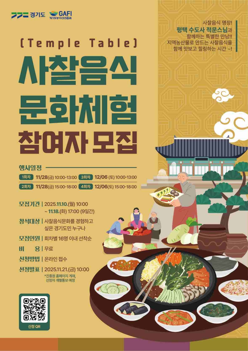사찰음식문화체험은 16명씩 4개 체험을 선착순 모집하며, 경기도민 누구나 참여할 수 있다. 참가 신청은 오는 10일 오전 10시부터 18일 오후 5시까지 진행되며, 포스터에 안내된 큐알(QR)코드를 통해 가능하다.