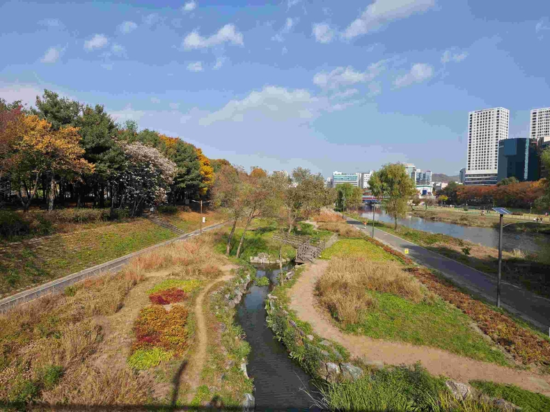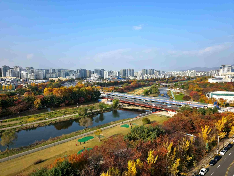 금곡공원 구간에 들어서면 풍경은 한결 넉넉해진다. 불정교 아래에는 비가 와도 즐길 수 있는 테니스 연습장이 꾸준히 사람들을 부른다. 이곳의 가을은 활동과 휴식이 공존한다. 공원의 평평한 잔디 위에 앉아 강바람을 맞다 보, 탄천이 성남 도심 리듬을 조정하는 거대한 호흡기처럼 느껴진다.