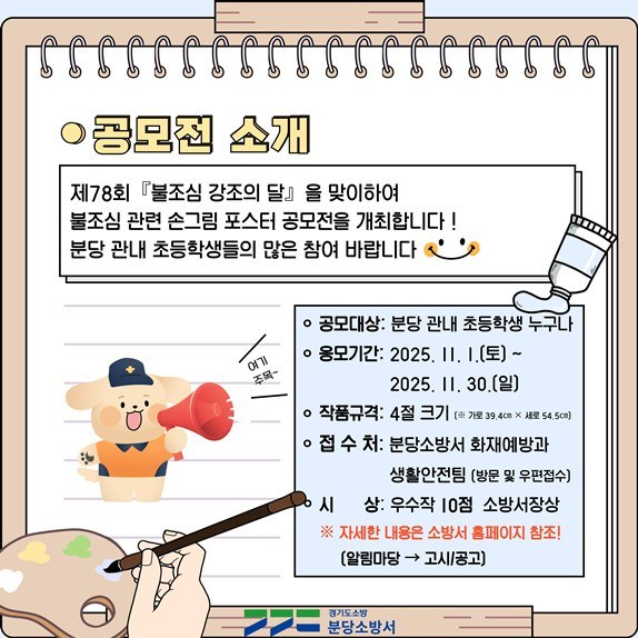 참가 대상은 분당구에 거주하는 초등학생으로, ‘불조심 강조의 달’을 맞아 화재예방 및 안전 공감대를 형성할 수 있는 내용을 주제로 한 손그림 포스터 작품을 접수받는다. 접수 기간은 2025년 11월 1일부터 11월 30일까지이며, 분당소방서를 직접 방문하거나 우편을 통해 제출이 가능하다.