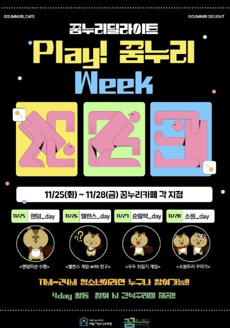 [ 타임즈 - 김시창 기자 ] 의왕시청소년재단 산하 의왕시청소년수련관 꿈누리카페(▲고천점( 문화공원로 33), ▲내손점(복지로 109), ▲오전점(찬우물길 11), ▲백운밸리점(백운중앙로 74, 총 4개 지점))는 오는 11월 25일부터 28일까지 4일간 꿈누리딜라이트 『Play! 꿈누리 Week』를 진행한다고 밝혔다.