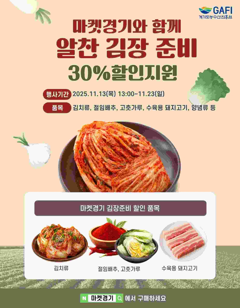 이번 기획전은 최근 김장 재료 가격 상승으로 인한 도민 장바구니 부담을 완화하고, 김장철 물가안정에 기여하기 위한 행사로 마련됐다. 행사기간 동안 절임배추, 김치속, 완제품 김치류, 고춧가루, 수육용 돼지고기, 양념류 등 주요 김장 품목에 대해 30% 할인을 지원한다. 할인쿠폰은 행사 기간 동안 하루 1회 발급 가능하며, 최대 3만원까지 혜택을 받을 수 있다. 모든 쿠폰은 마켓경기 내 행사 상품에 한해 당일 발급·사용이 가능하다. 보다 많은 상품 목록은 네이버 스마트스토어 ‘마켓경기’에서 확인 가능하다.