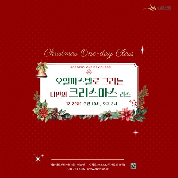 12월 2일에는 오전 10시와 오후 2시, 성남아트센터 아카데미 미술실에서 회화작가 남지혜의 ‘오일파스텔로 그리는 나만의 크리스마스 리스’를 만날 수 있다. 전문 강사의 지도로 오일파스텔의 기본 사용법을 배운 후 목화와 열매, 솔방울 등 다양한 크리스마스 오브제 표현 실습을 거쳐 자신만의 리스를 그려보는 과정까지 진행한다. 리스 완성 후에는 오일파스텔 표현법을 활용한 작은 크리스마스 엽서까지 제작할 수 있다. 연말 시즌을 맞아 가족과 친구, 연인과 함께 특별한 크리스마스 분위기를 만끽할 기회다.