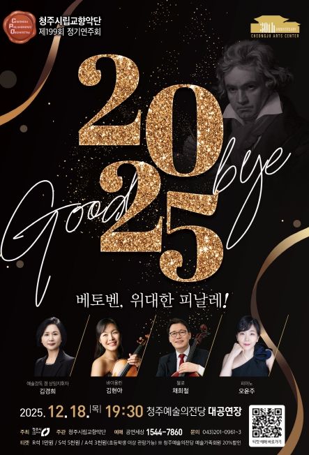[ 타임즈 - 김시창 기자 ] 청주시립교향악단은 오는 12월 18일 오후 7시 30분 청주예술의전당 대공연장에서 제199회 정기연주회 ‘Good bye 2025 – 베토벤, 위대한 피날레!’ 공연을 개최한다.