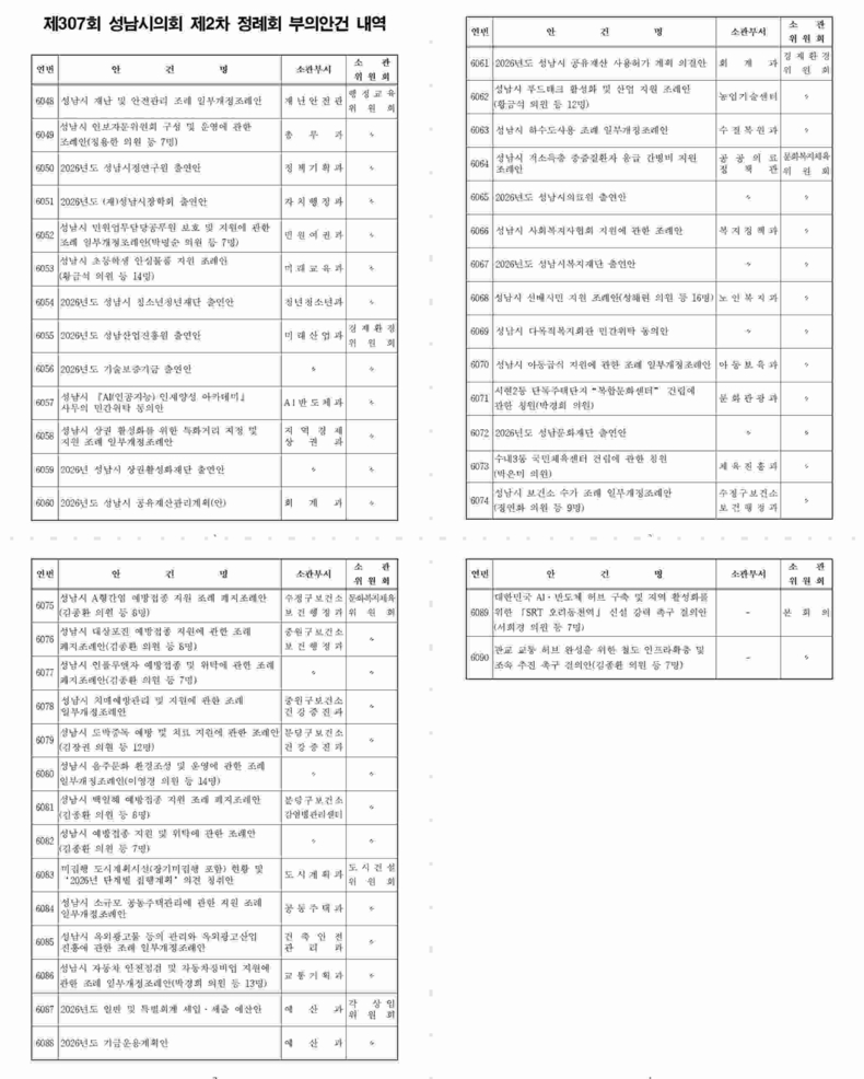 제307회 성남시의회 제2차 정례회 부의안건 내역