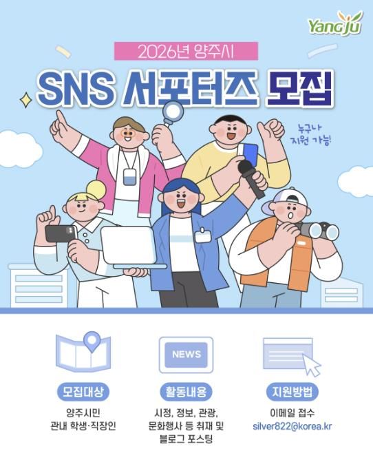 [ 타임즈 - 김시창 기자 ] 양주시가 시민과 소통하며 시정 소식과 지역의 숨은 매력을 널리 알릴 '2026년 양주시 SNS 서포터즈'를 오는 12월 1일부터 10일까지 10일간 모집한다.