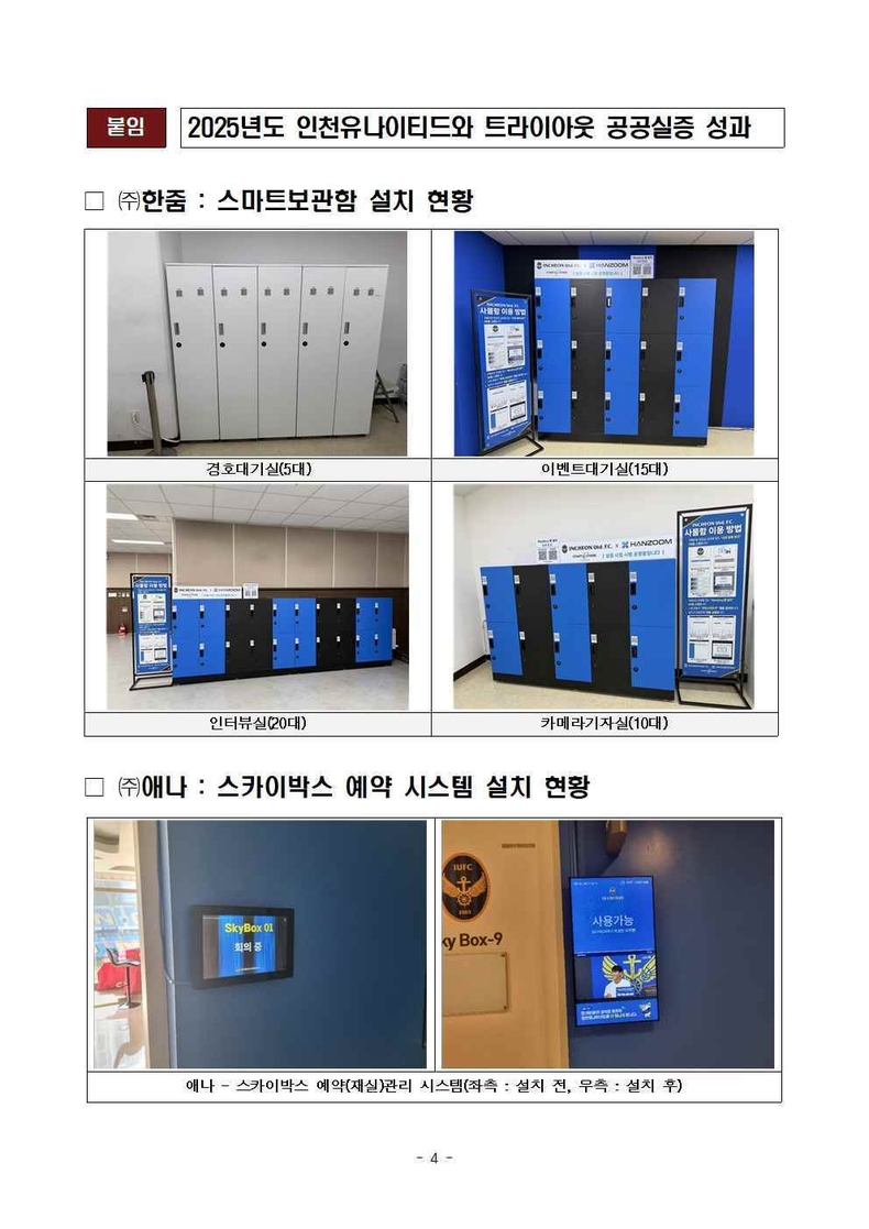 최경식 ㈜한줌 대표는 “축구경기장에서 국내 최초로 스마트 보관함을 설치, 검증할 수 있는 좋은 기회를 얻어 감사드린다. 이번 우수한 평가를 바탕으로 사업 확장에 더욱 매진하겠다”라고 말했다.