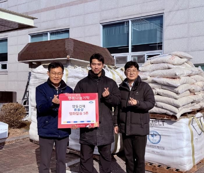 [ 타임즈 - 김시창 기자 ] 양평군 양동면은 지난 19일 양동건재 류용상 씨가 양동면사무소를 방문해 겨울철 제설작업에 사용될 염화칼슘 5톤을 기탁하며 지역사회 안전과 이웃사랑 실천에 동참했다고 밝혔다.