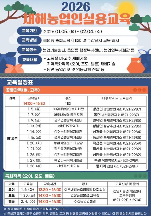 [ 타임즈 - 김시창 기자 ] 천안시농업기술센터는 내년 1월 5일부터 2월 4일까지 ‘새해농업인실용교육’을 추진한다고 26일 밝혔다.
