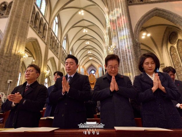 [ 타임즈 - 김시창 기자 ] 이재명 대통령과 김혜경 여사가 25일 서울 중구 명동대성당에서 열린 성탄 대축일 미사에서 기도를 하고 있다.