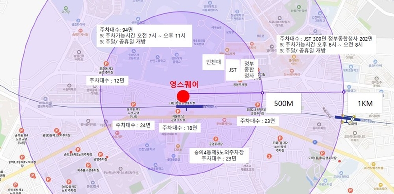 ○ 한편, 본 공사로 인해 기존 제물포역 북부 공영주차장(74면)이 철거됨에 따라, iH는 공사 기간 시민 불편을 최소화하기 위해 인천대학교(94면), 제물포스마트타운(309면), 정부종합청사(202면) 등 인근 부설주차장을 활용해 주차 수요를 충당할 계획이다.
