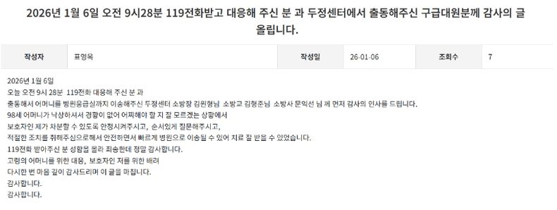 환자의 보호자는 천안서북소방서 칭찬게시판을 통해 “경황이 없는 상황에서 보호자인 제가 차분해질 수 있도록 안정시켜 주시고, 순서 있게 질문해 주셔서 적절한 조치를 할 수 있었다”며 “덕분에 어머니를 빠르게 병원으로 이송해 치료를 받을 수 있었다”고 깊은 감사의 뜻을 전했다.