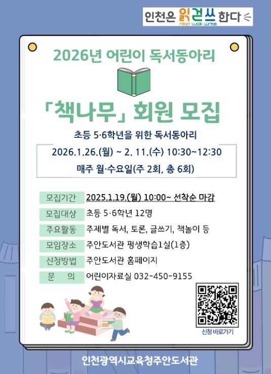[ 타임즈 - 김시창 기자 ] 인천광역시교육청주안도서관은 예비 초등 5·6학년 학생을 대상으로 하는 독서동아리 '책나무' 회원을 모집한다.