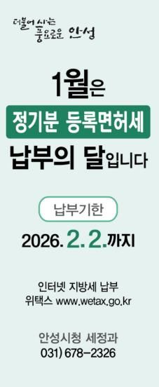 안성시 관계자는 “등록면허세 납부기한은 2월 2일까지로, 납기 마지막 날에는 민원인이 몰려 혼잡하거나 온라인 접속이 지연될 수 있으므로 조기 납부를 부탁드린다”고 당부했다.