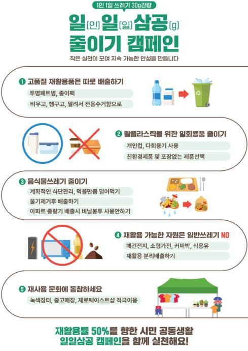 [ 타임즈 - 김시창 기자 ] 안성시는 시민의 자발적인 실천을 통해 재활용률을 높이고 생활쓰레기 발생량을 줄이기 위한 ‘1인 1일 쓰레기 30그램 줄이기(일일삼공) 캠페인’을 적극 추진하고 있다고 밝혔다.