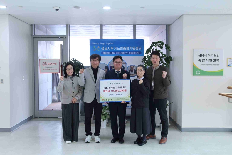 한동건설(대표이사)은 지난 15일, 성남 나눔 클럽이 추진하는 ‘안심 요구르트(비타음료)배달 사업’을 지원하기 위해 성남시 독거노인종합지원센터에 후원금 1,000만 원을 전달했다고 밝혔다.