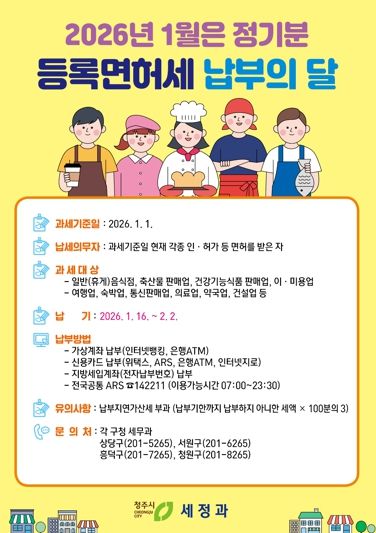 등록면허세 납세의무자는 2026년 1월 1일 현재 청주시에 주소 또는 사업장 소재지를 두고 각종 면허(허가·인가·영업신고 등)를 받은 개인 또는 법인으로, 면허 종류별로 등록면허세를 납부해야 한다.