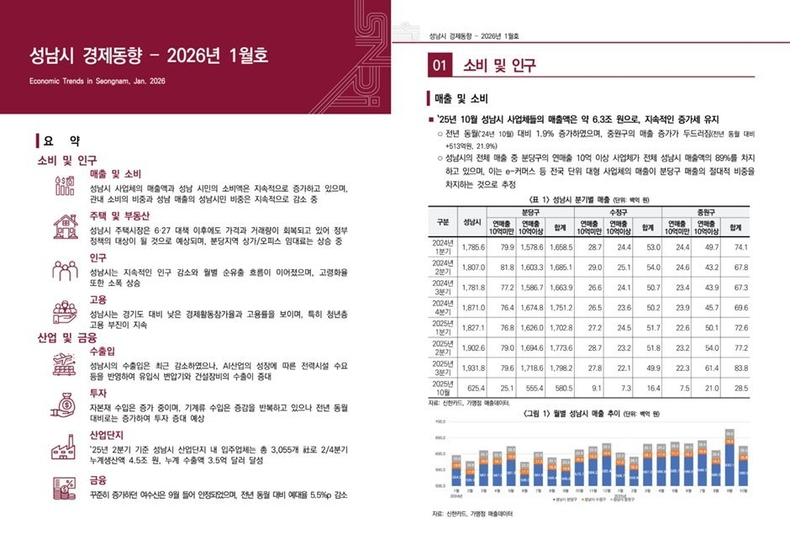 「성남시 경제동향」은 소비·인구, 고용, 산업·금융, 주택·부동산 등 주요 분야별 지표를 정기적로 정리해 성남시 경제의 변화 양상을 지속적으로 기록하는 데 목적을 두고 있다.