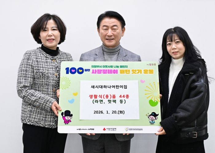 [ 타임즈 - 김시창 기자 ] 의정부시는 1월 20일 새시대하나어린이집이 ‘100일간 사랑릴레이 배턴 잇기’에 동참해 관내 저소득층을 위한 생활식(용)품 44종(라면, 핫팩 등)을 기부했다고 밝혔다.