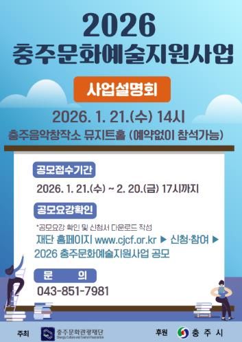 [ 타임즈 - 김시창 기자 ] (재)충주문화관광재단은 충주시 예술인 및 예술단체의 창작활동 기반을 마련하여 문화예술 생태계를 조성하고자 1월 19일부터‘2026 충주문화예술지원사업’공모를 진행하고 있다고 밝혔다.