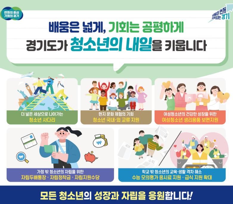 [ 타임즈 - 김시창 기자 ] 경기도가 청소년의 건강한 성장과 배움 기회, 생활 안정을 위해 급식, 학습·진로·자립 지원까지 아우르는 다양한 정책을 추진한다.
