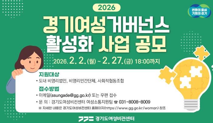 [ 타임즈 - 김시창 기자 ] 경기도여성비전센터가 오는 2월 27일까지 경기여성거버넌스 활성화 공모사업 수행 단체를 모집한다.