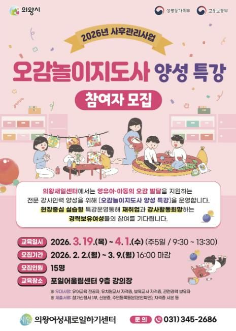 [ 타임즈 - 김시창 기자 ] 의왕시 여성새로일하기센터가 '오감놀이지도사 양성 특강'의 교육생을 모집한다.