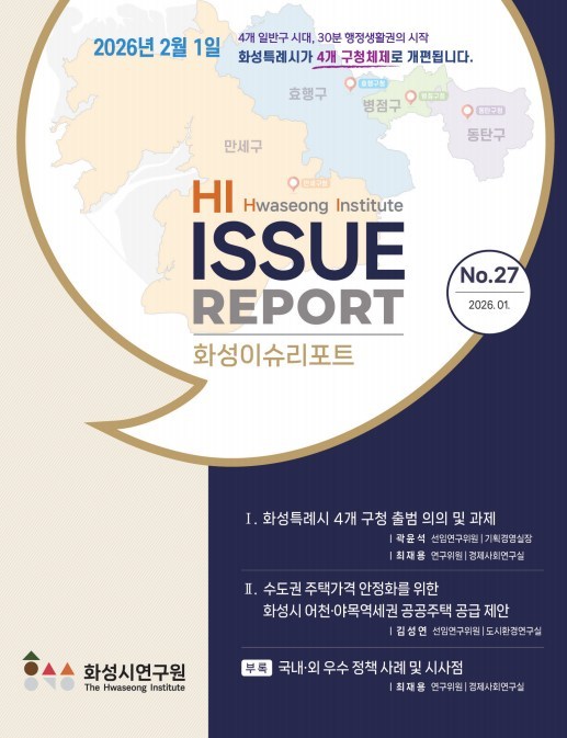 화성이슈리포트 제27호에서는 ‘화성특례시 4개 구청 출범 의의 및 과제’와 ‘수도권 주택가격 안정화를 위한 화성시 어천․야목역세권 공공주택 공급 제안’을 주제로 시정 현안을 다뤘다.