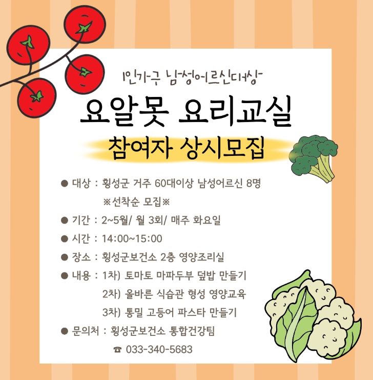 [ 타임즈 - 김시창 기자 ] 횡성군은 1인가구 남성 어르신의 건강한 식생활 형성과 영양관리 강화를 위해 2월부터 5월까지 “요알못(요리를 알지 못하는) 영양교실”을 운영한다.