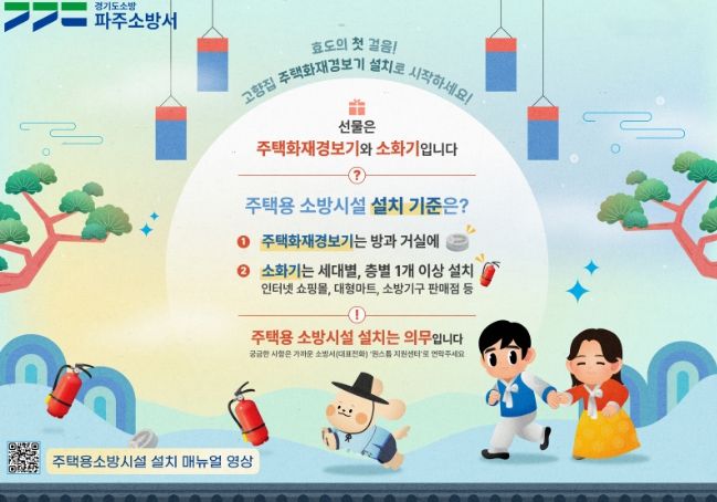 명절 기간은 귀향·귀성으로 인한 거주자 부재, 난방기기·조리기구 사용 증가 등으로 화재 발생 위험이 높은 시기다. 특히 단독주택은 초기 화재 대응 장비가 부족해 인명피해로 이어질 가능성이 크다. 이에 파주소방서는 단독경보형감지기와 소화기 설치를 통해 가족에게 ‘안전’을 선물하자고 강조하고 있다.