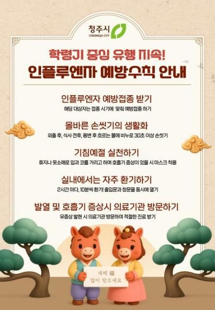 또한 2월을 인플루엔자 예방수칙 집중 홍보기간으로 지정해 설 연휴 전·중·후 기간 동안 홈페이지·블로그·SNS 채널을 활용한 예방 홍보를 추진하고, 어린이집·유치원·학교 등 집단시설을 대상으로 유증상자 관리와 예방수칙 이행 사항을 적극 안내하고 있다.