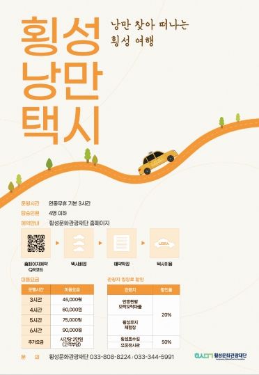 한편, 낭만택시 이용 방법과 상세한 할인 일정은 향후 횡성문화관광재단 누리집(홈페이지)을 통해 공지될 예정이다.