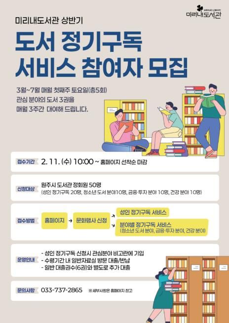 [ 타임즈 - 김시창 기자 ] 원주시 미리내도서관은 오는 11일부터 ‘2026년 상반기 도서 정기구독 서비스’ 참여자를 모집한다.