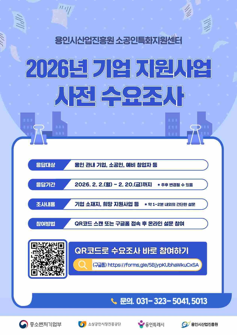 수요조사는 오는 2월 20일까지 온라인 설문조사 방식으로 진행되며, 참여를 희망하는 기업은 용인기업지원시스템(ybs.ypa.or.kr) 또는 홍보 포스터 내 QR코드를 통해 참여할 수 있다.