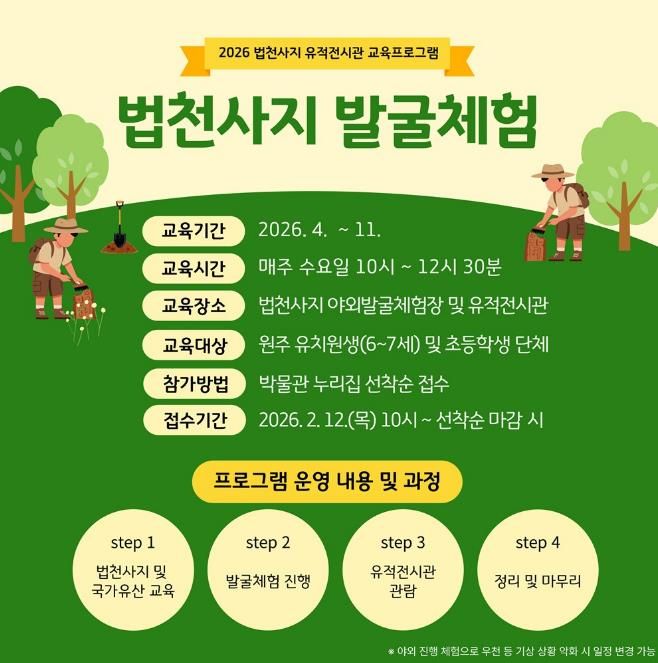 이번 체험은 관내 유치원(6~7세) 및 초등학교 단체를 대상으로, 일정은 4월부터 11월까지 총 20회(매주 수요일) 진행될 예정이다. 장소는 법천사지 유적전시관 및 야외 발굴장으로, 국가유산 발굴기관 강사와 함께 역사 교육 및 발굴 체험을 진행한다.