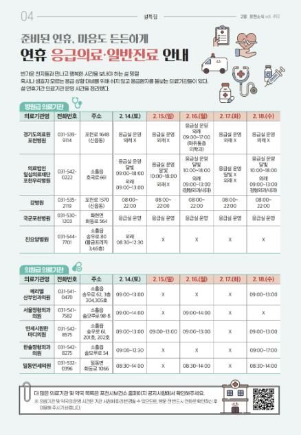 연휴 기간 진료가 가능한 병의원과 약국 정보는 포천시보건소 누리집과 공식 누리소통망(SNS)을 통해 확인할 수 있으며, 응급의료정보제공 앱과 응급똑똑 앱을 통해서도 실시간 조회가 가능하다. 이와 함께 119 구급상황관리센터와 129 보건복지콜센터를 통해서도 관련 안내를 받을 수 있다.