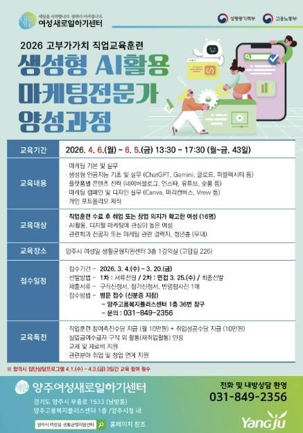 [ 타임즈 - 김시창 기자 ] 양주여성새로일하기센터에서는 오는 3월 4일부터 20일까지 직업교육훈련 과정인 ‘생성형 인공지능(AI)활용 마케팅전문가 양성과정' 교육생을 모집한다.