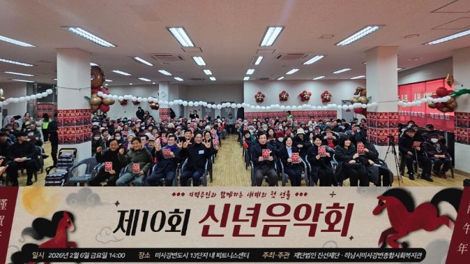 [ 타임즈 - 김시창 기자 ] 2026년 붉은 말의 해 병오년을 맞이하여 하남시미사강변종합사회복지관과 재단법인 진선재단은 지난 6일 ‘제10회 지역주민 신년음악회’를 공동 주최·주관하고, 300명 이상의 지역주민이 참석한 가운데 새해의 힘찬 시작을 알렸다.