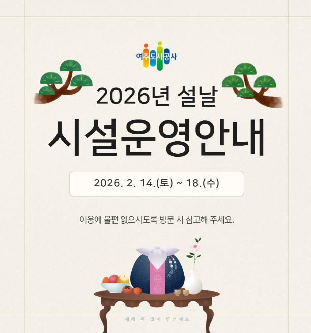 [ 타임즈 - 김시창 기자 ] 여주도시공사가 다가오는 2026년 설 연휴를 맞아 시민과 귀성객들이 안전하고 편안한 명절을 보낼 수 있도록 주요 시설 운영시간 조정 및 특별 서비스를 시행한다고 밝혔다.