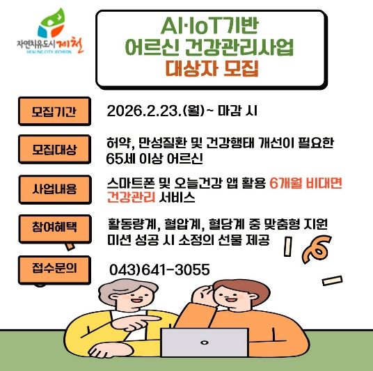 [ 타임즈 - 김시창 기자 ] 제천시보건소(소장 안순덕)는 인공지능(AI)과 사물인터넷(IoT) 기술을 활용해 어르신들의 만성질환을 체계적으로 관리하는‘AI·IoT 기반 어르신 건강관리사업’참여자를 오는 23일부터 모집한다.